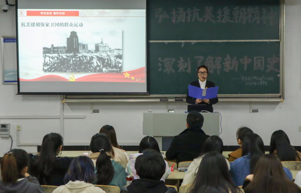 此次宣讲内容采取线下宣讲和线上直播相结合。第一部分“牢记历史 缅怀先烈”从抗美援朝的背景讲起,回顾了中国人民志愿军和英雄先烈们的光辉事迹。第二部分“打得一拳开 免得百拳来”讲述了抗美援朝“长津湖战役”“马良山战役”“上甘岭战役”三大战役及其历史意义。第三部分“英雄莫敢忘 我辈当自强”宣传抗美援朝伟大精神,并结合新冠疫情中举国上下同心抗“疫”的事例指出“时代在变换,但时代英雄永不变”,以此提出对新时代青年们的要求。宣讲过程中还进行了有奖问答活动,同学们纷纷举手抢答。