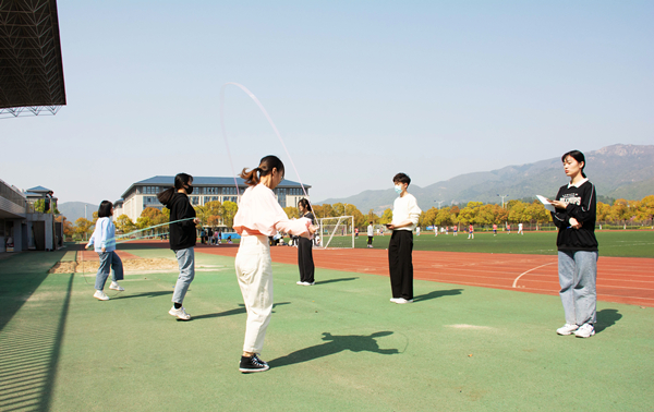 “怎么办?我好慌呀!”比赛还没开始,同学们就开始无比的紧张与期待,还有同学发出豪言壮语:“我一定可以取得好成绩!不然就浪费了这几天的突击练习。”在抽签确定比赛顺序后,跳绳比赛分为三人一组,每人面前都有一位计数员。只见裁判员一声令下,跳绳比赛正式开始。参赛同学跳跃着双脚,挥动着双臂,脚尖与地面摩擦出动听的乐章,手中跳绳在空中舞出一条优美的弧线。而场下的同学也没有闲着,有的呐喊助威,不停的为参赛选手加油鼓励;有的赛前热身,不停的调试合适的跳绳长度,他们都成为了运动场上一道靓丽的风景线。参加跳绳比赛的2021级学科思政专业唐鑫说:“研二研三的学长学姐们太厉害了!我都使出浑身解数了,还是跳不到一分钟170个以上!”