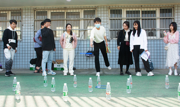 在跳绳比赛进行得如火如荼的同时,套圈比赛也拉开了帷幕。工作人员在介绍比赛规则后说:“套圈游戏以抽签的方式规定先后次序,大家要注意好自己的比赛时间和顺序,现在请第一位同学入场。”在投掷的时候,参加选手一个个都全神贯注,寻找角度,调整站位,全力以赴。这时场下传来了2021级马克思主义理论专业党员王欢的声音,她说:“不要使蛮劲,轻轻一放,圈中的几率就大了。”随着比赛的深入,出现了很多“套圈高手”,他们在相互切磋的同时相互鼓励,有的还为后面的选手分享成功经验,场上不时传来套中的欢呼声。马克思主义理论专业2021级李玉冰就用10个圈套中了六个矿泉水瓶,“哇,太厉害了吧!”围观的同学纷纷举起大拇指,发出感叹。