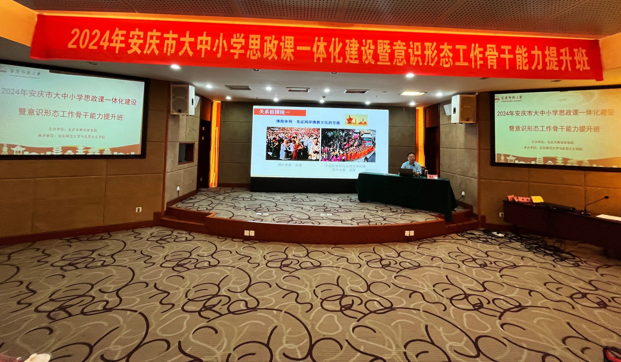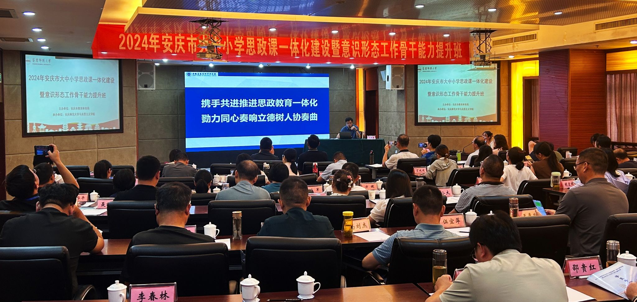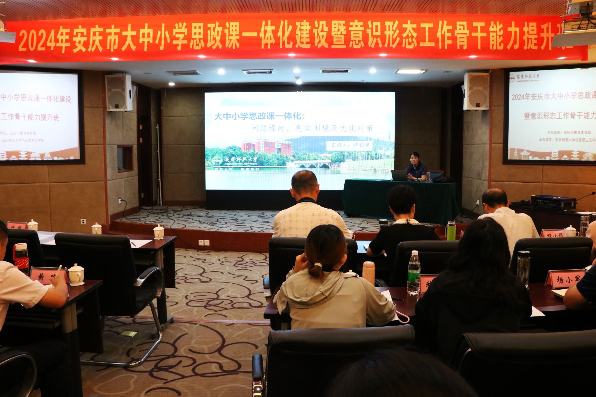 7月29日至8月2日,由安庆市教育体育局主办、太阳成tyc122cc集团承办的“第四届安庆市大中小学思政课一体化建设暨意识形态工作骨干能力提升班”在潜山举办,来自安庆市的大中小学思政课教师近百人参加此次培训学习。