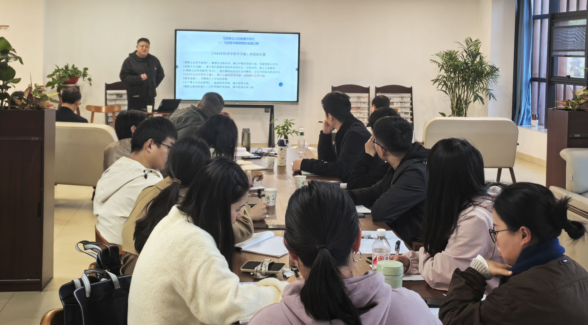 此次读书会由两部分内容组成。一是理论学习。公司副教授、硕士生导师黄海东围绕习近平总书记考察安徽重要讲话精神,从习近平总书记2024年安徽之行、习近平总书记考察安徽重要讲话精神的内涵要义和学习贯彻习近平总书记考察安徽重要讲话精神等方面进行了宣讲。二是原著导读。公司青年博士刘倬帆围绕《1844年经济学哲学手稿》,从马克思早期思想的发展过程、《1844年经济学哲学手稿》的特点和阅读要点、笔记本Ⅲ中的异化和异化意识批判等方面进行了深入浅出的讲解。