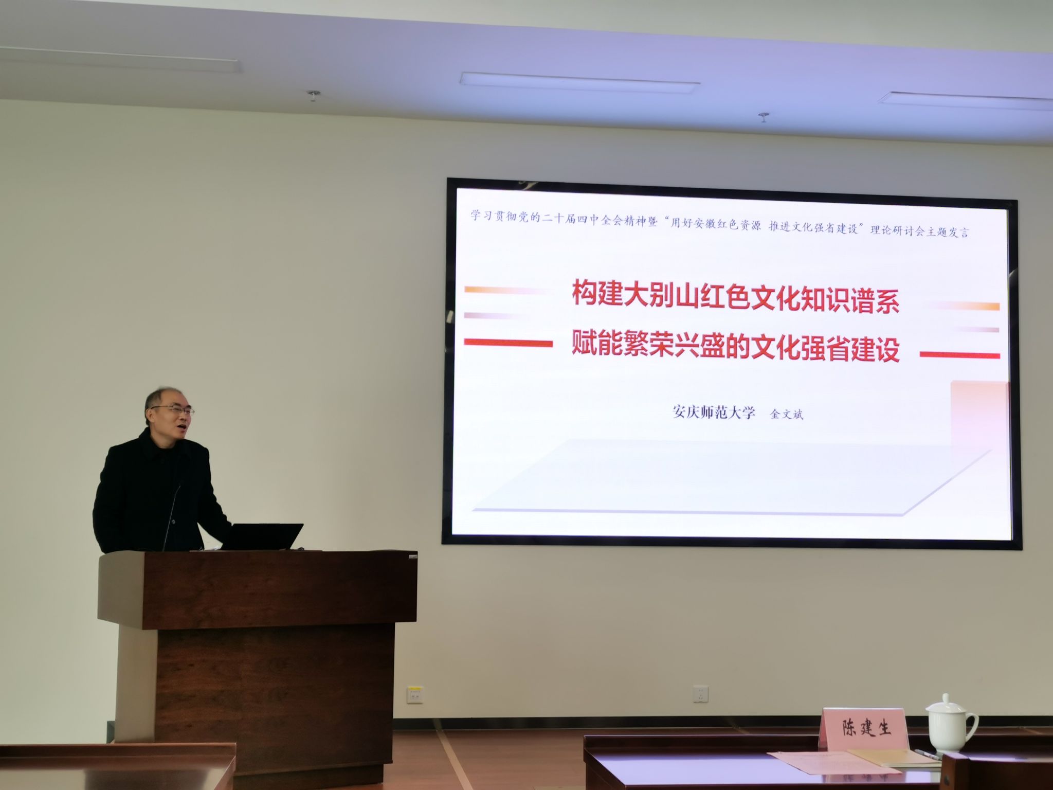 会上,金文斌教授以《构建大别山红色文化知识谱系,赋能繁荣兴盛的文化强省建设》为题作专题报告,系统阐述了大别山红色文化的历史脉络、知识建构路径及其在新时代文化强省建设中的价值与作用,为与会者带来新的视角与启发。(撰稿、摄影:俞鹏 编辑:田梦甜 审核:严仍昱)