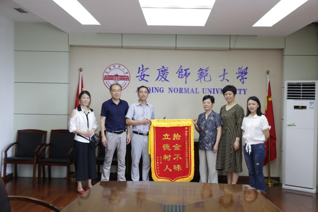 为了表示对金忠良的感谢,失主潮龙琴于6月4日上午同家人及社区的负责人一起专程赶到公司,将一面写有“拾金不昧,立德树人”的锦旗亲自送到了他手中。“那天下着雨,回家途中手里的东西多了,手提包也不知道落在哪了。多亏了金老师热心帮助,通过社区和派出所联系上我,不然啊钱包肯定找不回来了,太感谢金老师了!”潮龙琴向金忠良由衷道谢。
