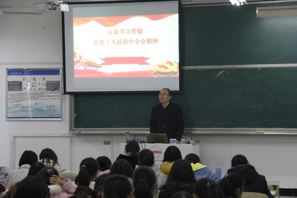 2019年11月26日,在教学楼A楼201教室,太阳成tyc122cc集团金文斌教授为思想政治教育专业2019级员工宣讲党的十九届四中全会精神。