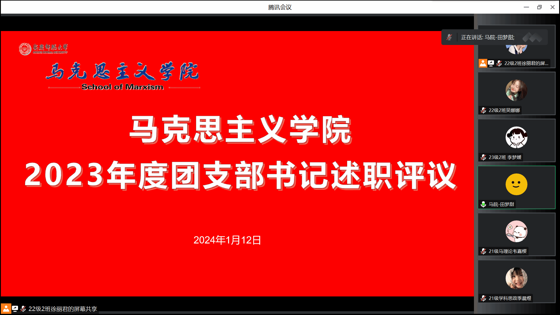 1月12日,公司团委组织开展2023年度团支书述职评议工作。公司团委委员、各班级团支书共20余人参加,公司团委副书记田梦甜、团委教师兼职副书记金炜康出席会议。