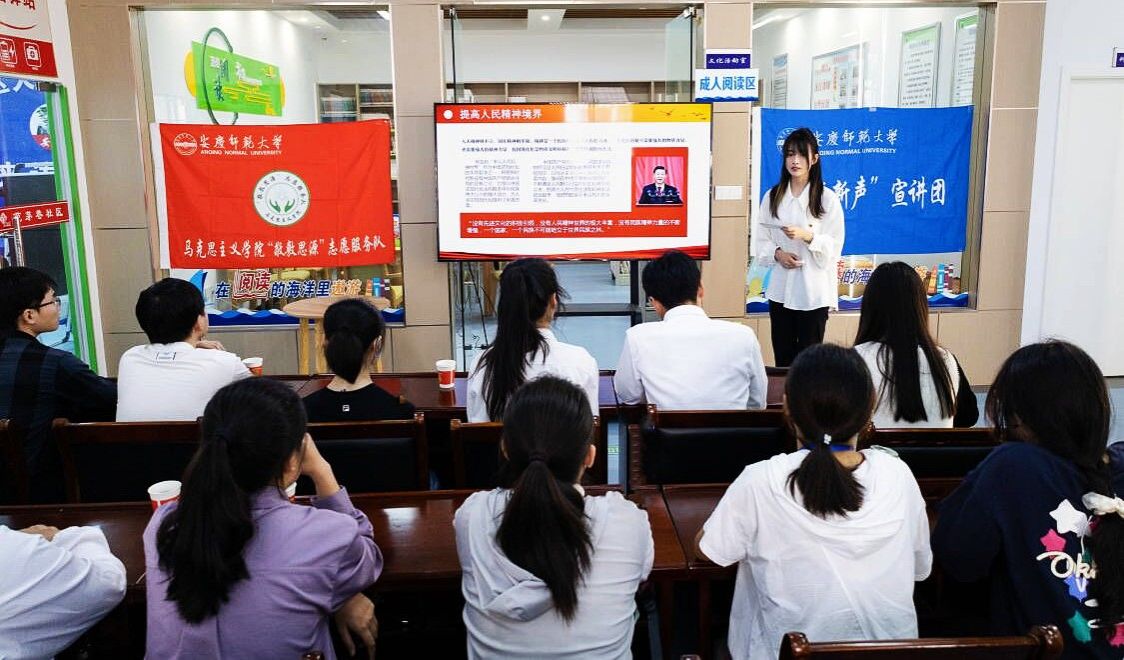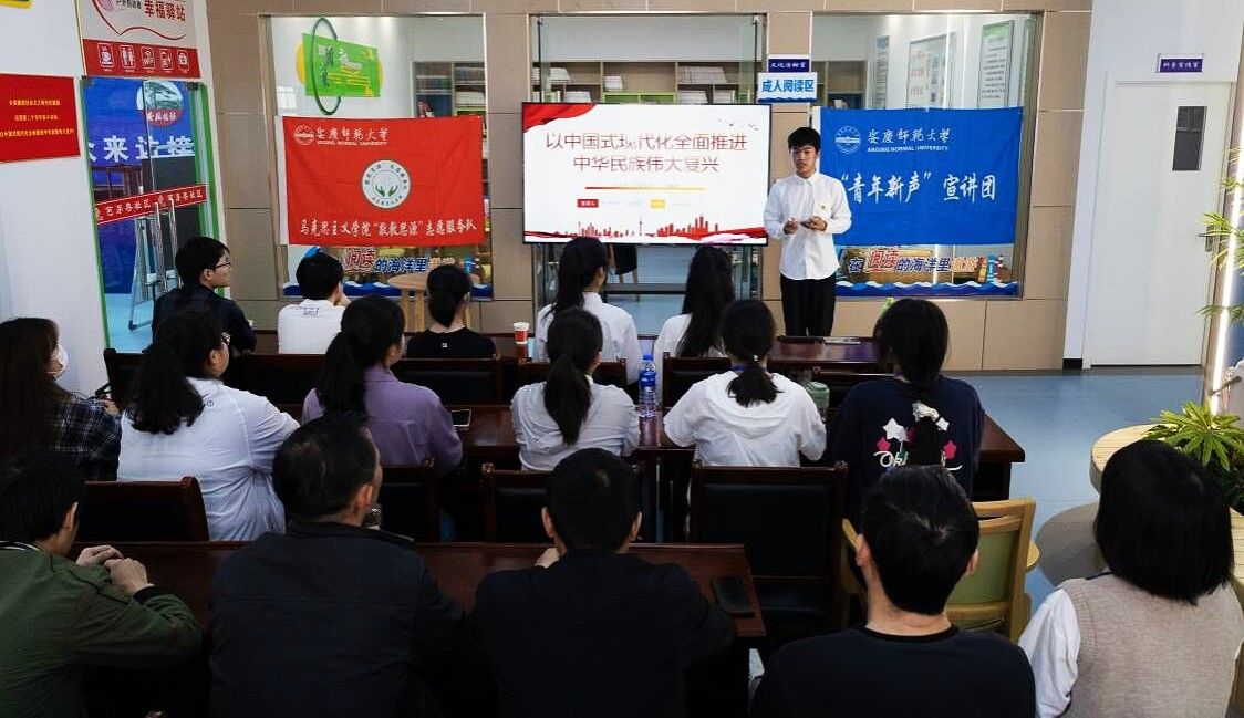 “‘绿水青山就是金山银山’最早是什么时候提出的呢?”宣讲团成员孙灿从“必须促进人与自然和谐共生”“必须推动构建人类命运共同体”“创造人类文明新形态”三个层面来阐述如何实现中国式现代化,并在宣讲中进行提问互动。“我们一直在探索宣讲的新思路、新形式,希望把党的二十大精神说具体、讲明白,让观众听得懂、记得住。”宣讲团负责人、思想政治教育专业2021级(3)班的孙荣说。