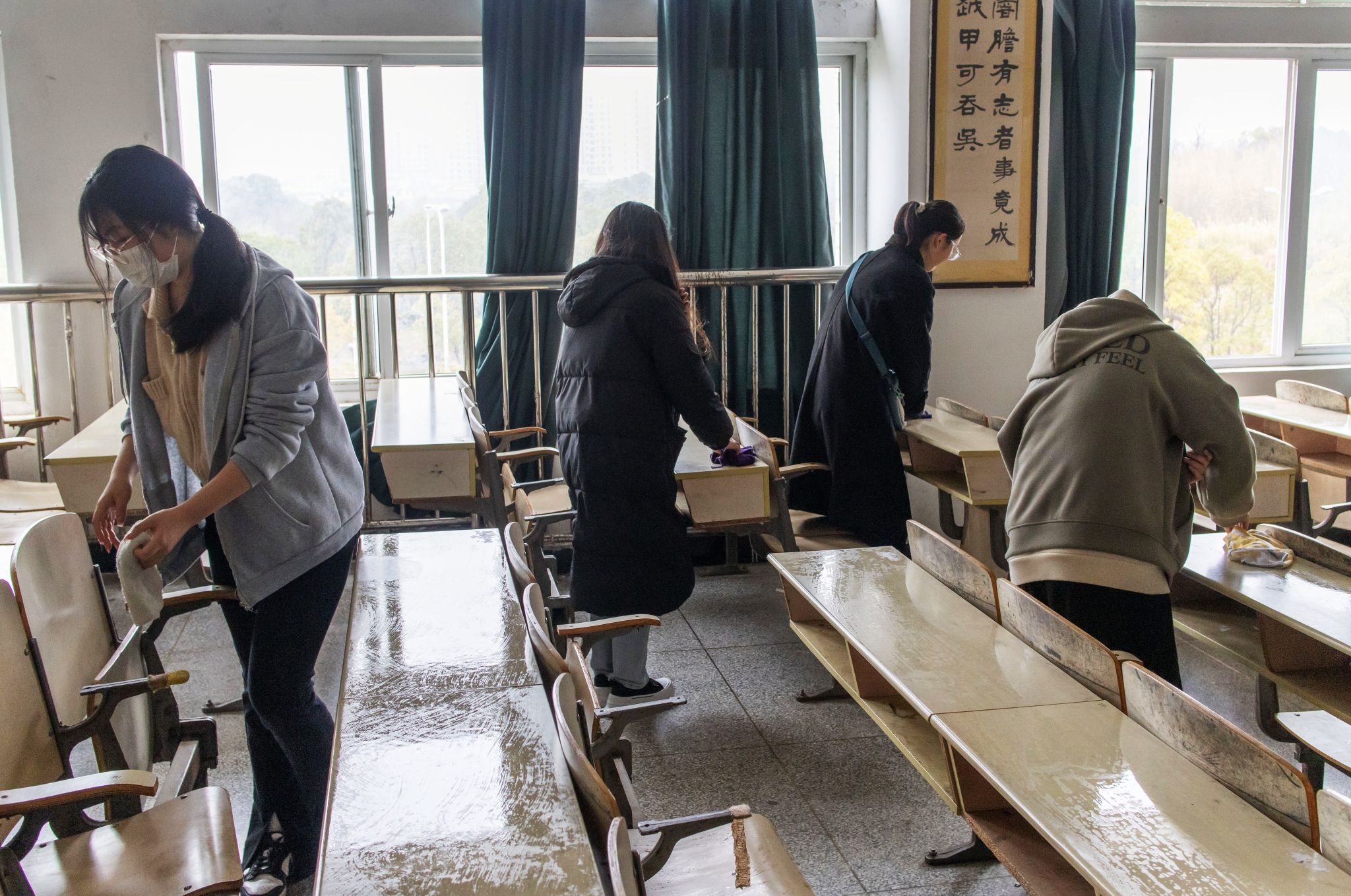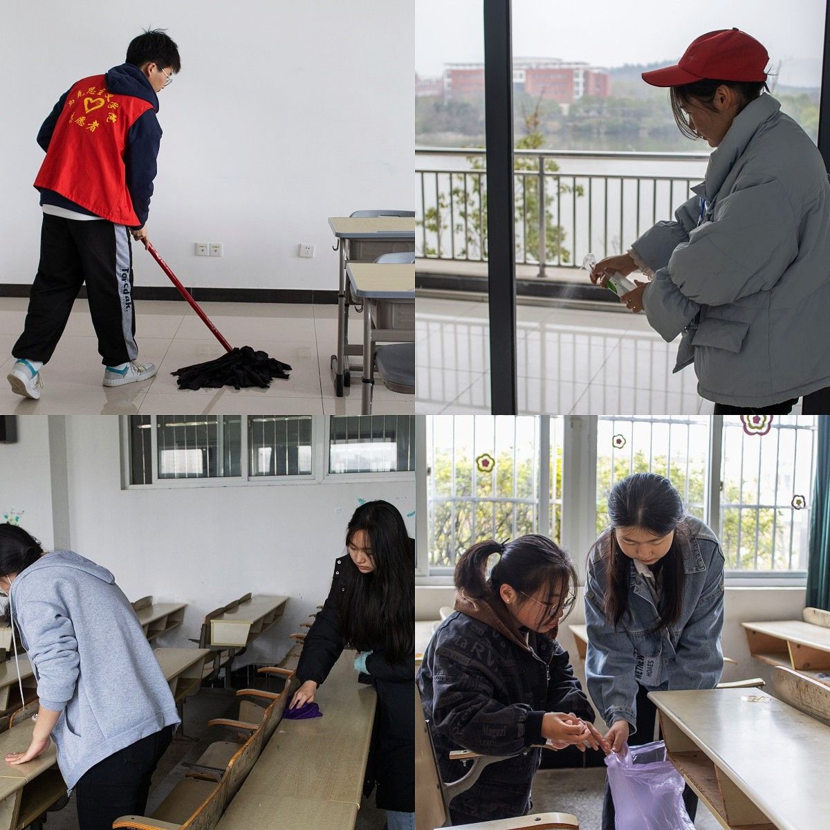 当日早上八点,255名志愿者在敬敷广场集中,简单分组后便由组长带领着前往小组所负责区域。文渊楼一楼的8个教室是第一小组的责任区,小组组长、思想政治教育专业2021级(2)班的刘东来带领着11名组员清理垃圾、擦洗桌凳、清洁消毒,按部就班地完成每一间教室的清扫任务。