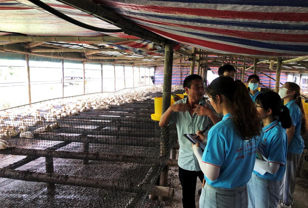 “一批番鸭每产批一万一千只,循环周期为80天到90天。我们养殖的番鸭只售卖鸭肉,不包含鸭蛋养殖和鸭苗选取。”刘先生告诉团队成员,番鸭养殖采用的是公司和农户结合的方式,农户只负责养殖,公司负责补充鸭苗和销售渠道,番鸭的进食食物也由公司进行营养配比,这种生产模式保证了农户稳定的收入来源。