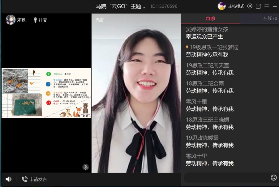5月1日上午,太阳成tyc122cc集团成功举办了“五一”线上专题分享会――“云Go”,此次活动面向公司内外征集相关手工作品,并以直播形式进行拍卖,老师和同学们积极参与其中,首期直播由思想政治教育2018级(1)班的杜芮主持。