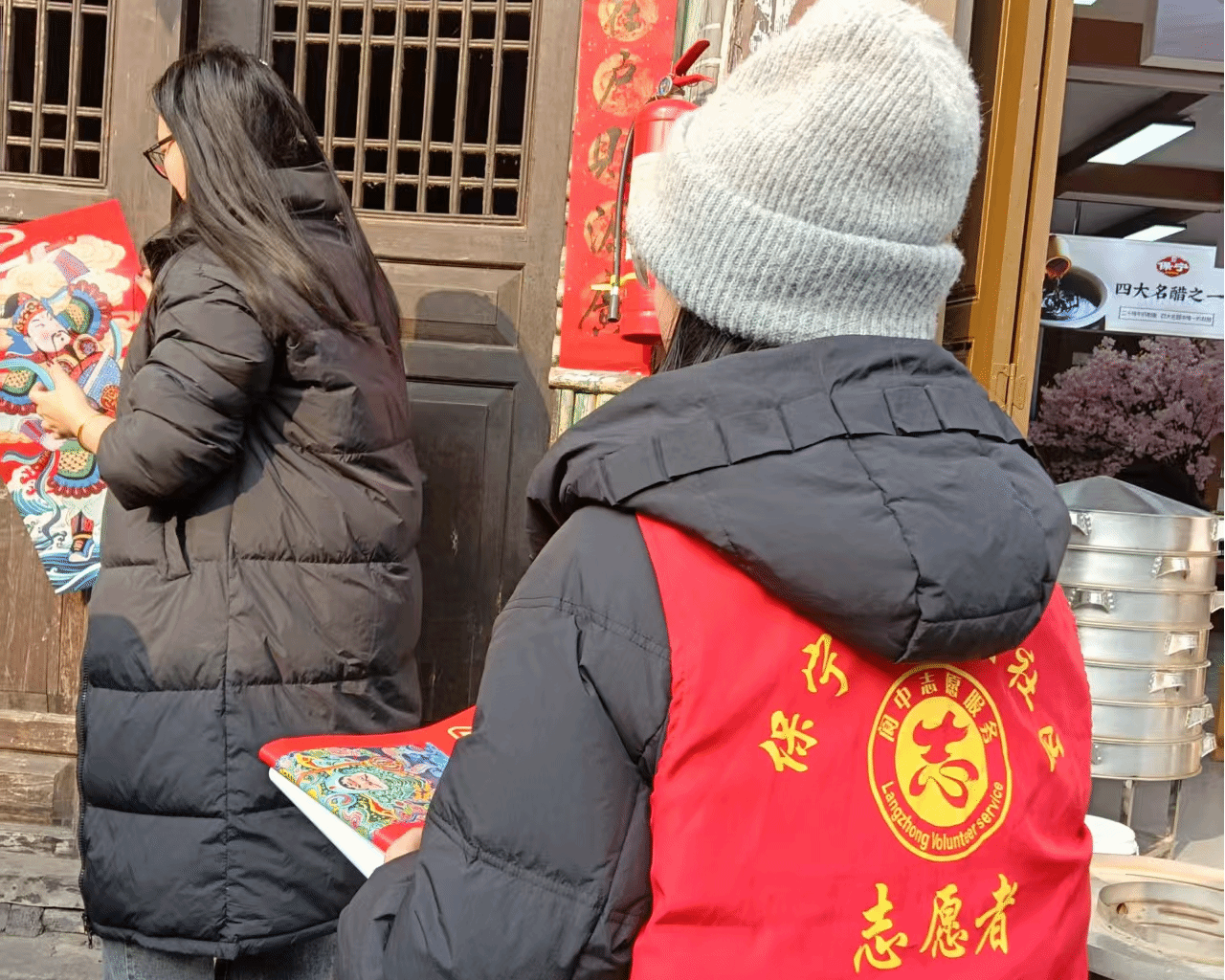 神色威严的门神、栩栩如生的小马、吉祥喜庆的福字……1月15日,2025级思想政治教育1班侯依涵在家乡四川阆中古城参加了“返家乡”社会实践。侯依涵和志愿者们在内东街社区手持寓意吉祥的年画,为古城住户和商铺送去新春祝福,老字号保宁醋坊的店主笑道:“贴上年画,年味儿一下子就浓了。”活动中,一位拄拐老人主动向志愿者讲解年画中秦琼、尉迟恭等门神的传统文化寓意,侯依涵深有感触:“一张年画虽小,却是家乡人对美好生活的期盼。”此外,她还与志愿者们投入古城清扫工作,在寒风中认真清理路面。“为家乡做事,不需要多么轰轰烈烈,一张年画、一次清扫就很有意义。”回顾这次实践,侯依涵表示,她希望未来能继续参与家乡建设,用点滴行动展现青年学子的社会责任。